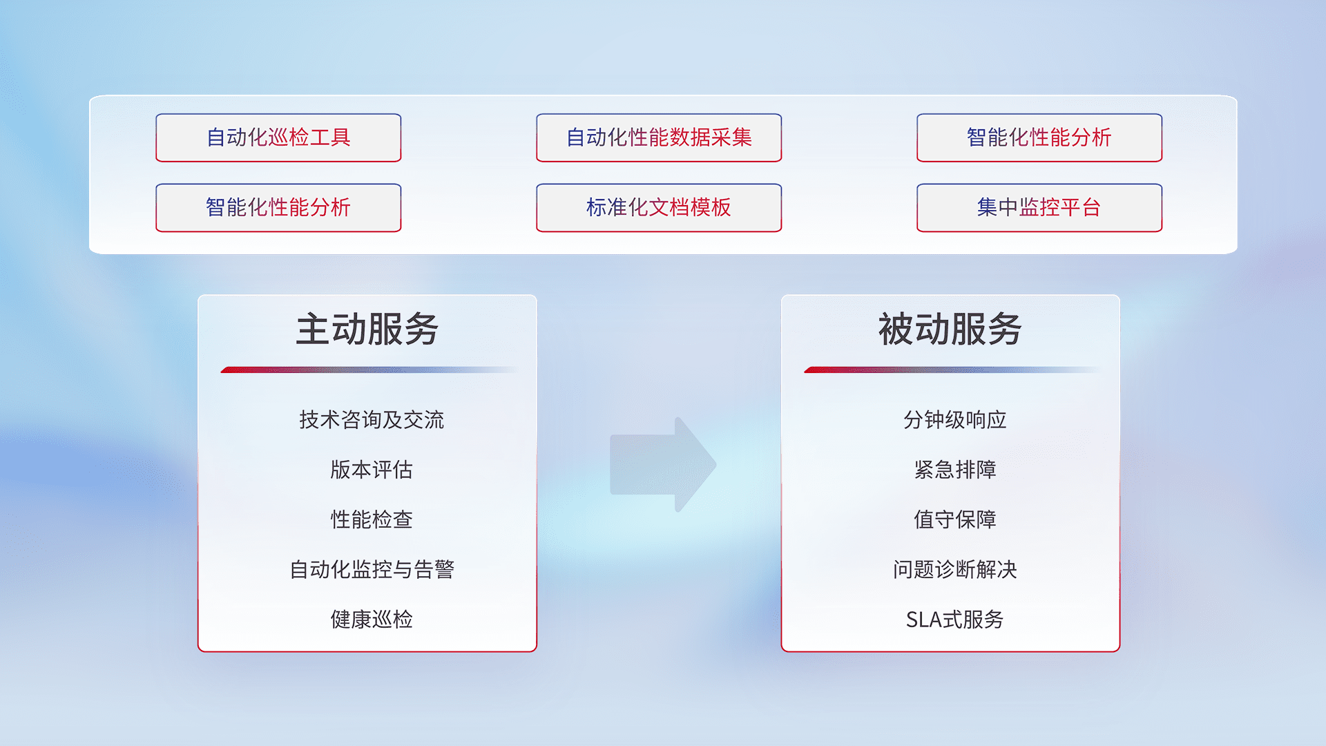 智能化工具和标准化文档,,,保障服务质量,,,提供主动服务(包含技术咨询、、、、版本评估、、性能检查、、、自动化监控与告警、、、健康巡检)和被动服务包含(分钟级响应、、、紧急排障、、值守保障、、、问题诊断解决、、SLA服务)。。。。